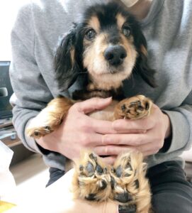 ハッピーはダックスなので顔がもじゃもじゃになることはありませんでしたが、2ヶ月もすると足裏はこんなに感じ😂爪切りや足裏バリカンはこの抱っこスタイルでいつもやっていました😌
